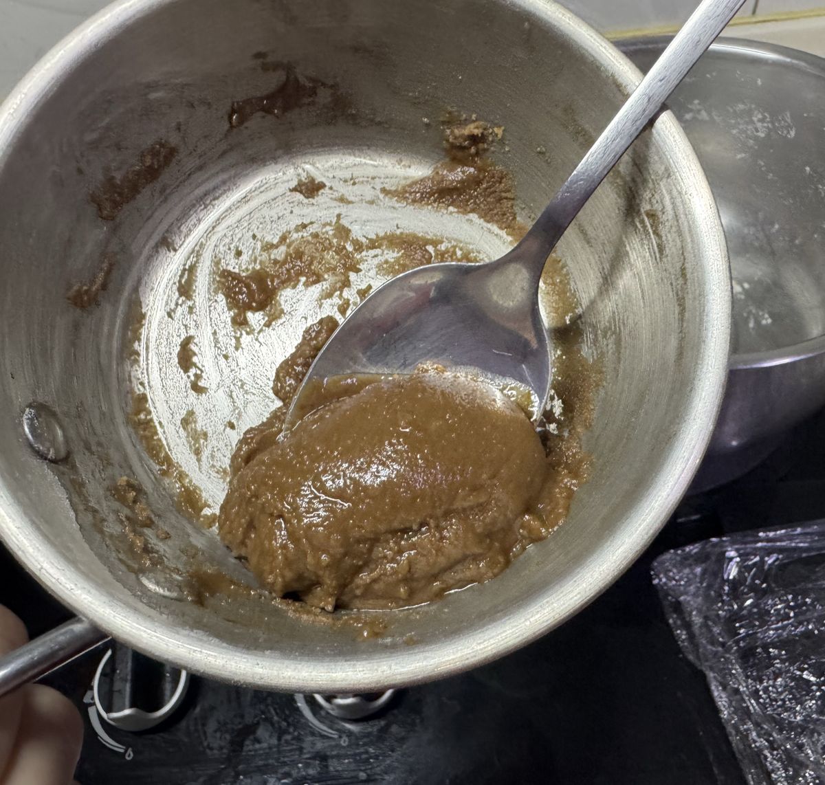 煮滾熱水後邊倒邊攪拌麵粉!