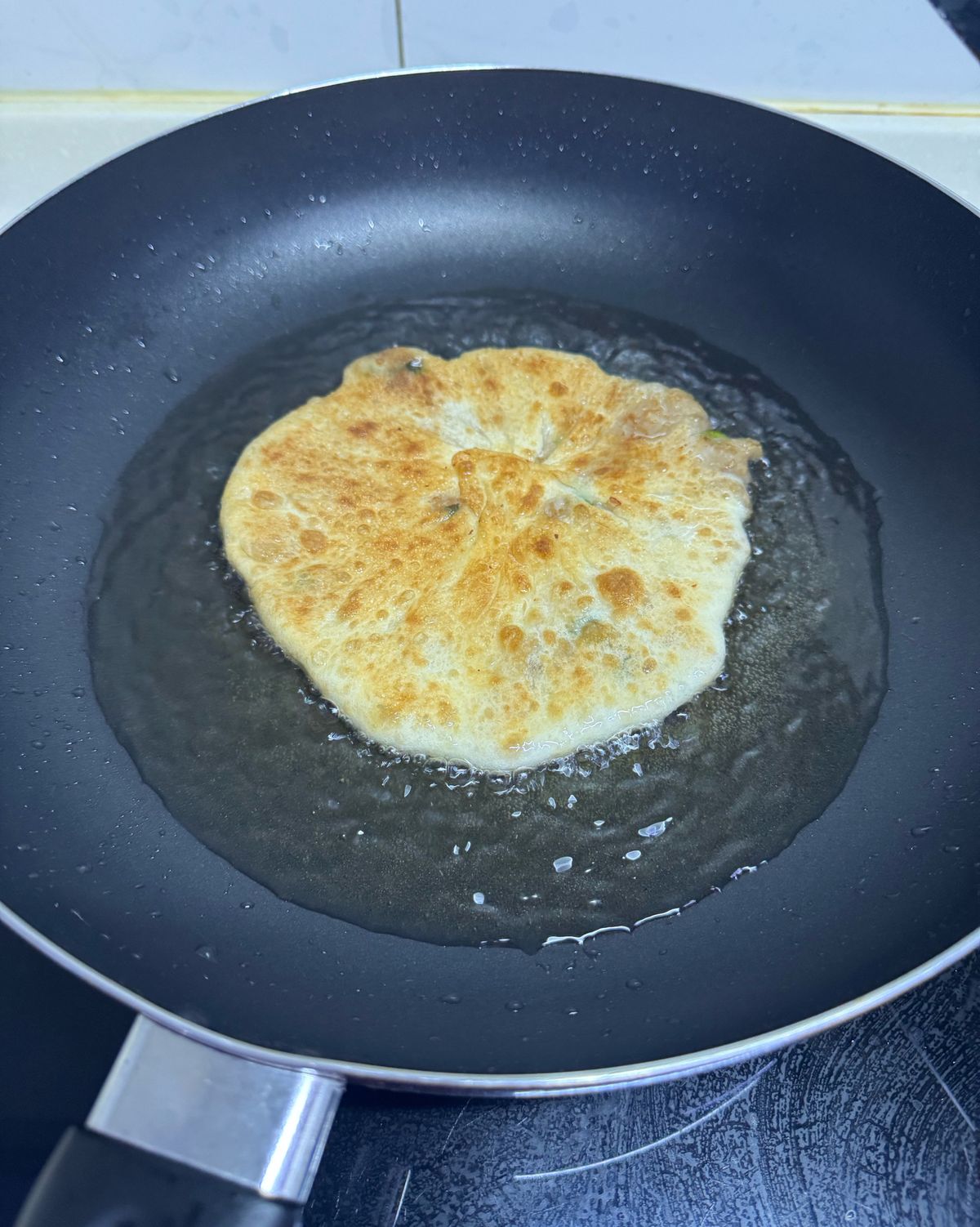 熱油鍋後放入蝦肉蔥餅,可以用鍋鏟稍微壓一下下!